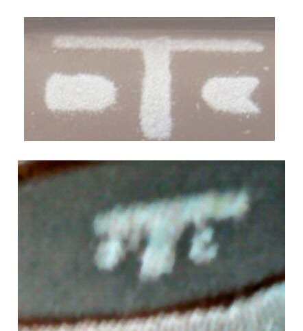 FAKE SIGNATURESHow pathetic is one who uses etching acid in an attempt to try to make anyone believe the signature on their item is actually the acid stamp used on the real deal? Pretty darn pathetic not to mention not legal (fraud). Below is an example of an attempted fake mark. Can you find the real mark?